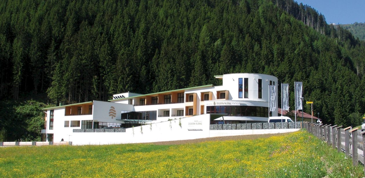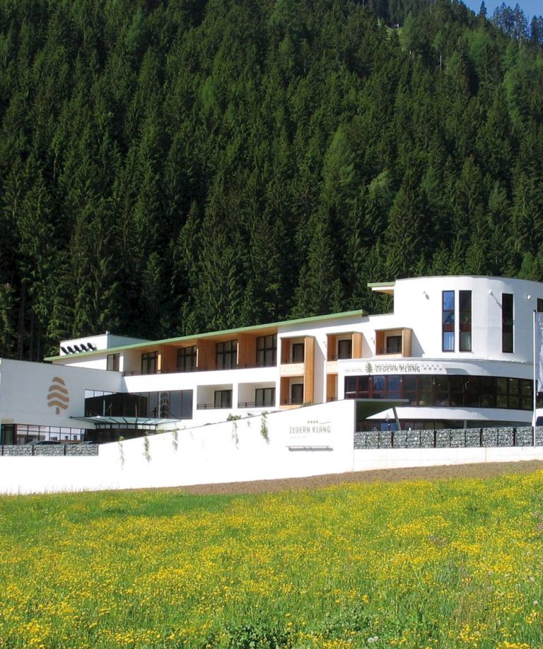 Der Name „Zedern Klang“ stammt von dem immergrünen Baum, der Zeder, dem Markenzeichen des Hotels. Dem energiereichen Zedernholz schreibt man heilende Eigenschaften zu; gleichzeitig symbolisiert es die naturnahe Philosophie des Spa-Hotels. Die Esche gilt aktuell als die wertvollste europäische Holzart. Ihre typisch lebhafte Maserung wird durch das Naturöl noch intensiviert. Die thermische Behandlung verleiht dem ursprünglich relativ hellen Holz eine warme, dunkelbraune Färbung, und die handgeschroppte Oberfläche schafft schließlich auch noch eine besonders natürliche Haptik.