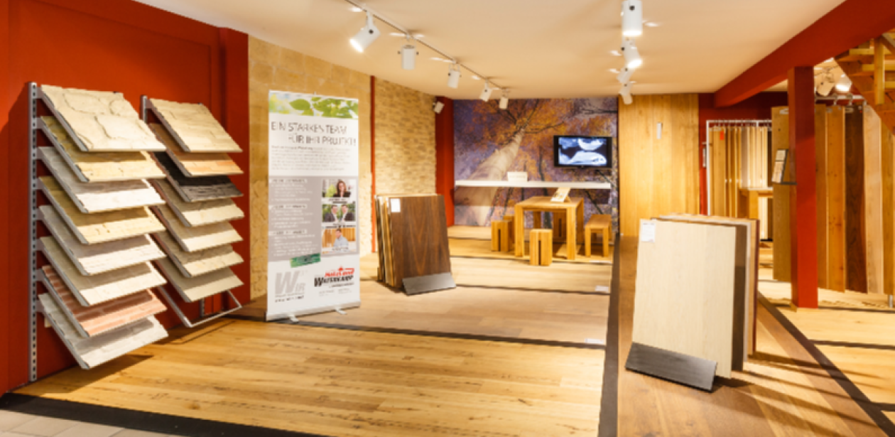 Die Produkte werden in ansprechenden informativ gestalteten Ausstellungen für Gartenholz, Türen, Böden und Fassaden präsentiert. In der Bodenausstellung werden mehr als 501 verschiedene Bodenmuster anschaulich dargestellt. Neben Fertigparkett, Laminat, Kork und Massivholzdielen finden Sie auch Linoleum und Vinylböden.