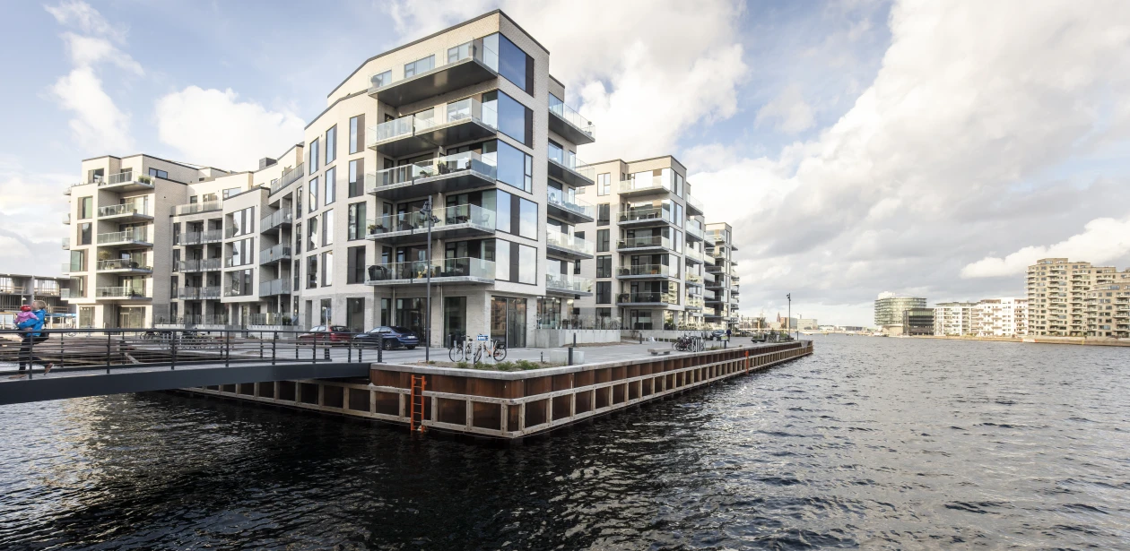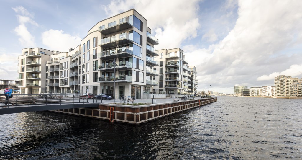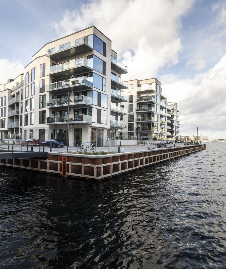 The project was developed in the former Copenhagen harbour in the Engholmene area, a location that is being transformed from an industrial port into exclusive neighbourhoods. Inspired by the canal and green landscapes of New York, Amsterdam and Venice, the architectural team of Claus Gröning that is overseeing the master plan for the Engholmene area introduced these ideas into the project. Water plays a central role in this project by serving as the essential element of life. The entire south side of the project is located across from the yacht harbour in Copenhagen, a place that serves as an anchor in the daily lives of city residents. The area is dotted with maritime facilities, restaurants, cafes, bars and small businesses.