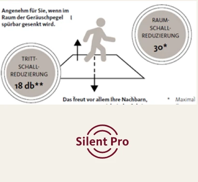 El aislamiento acústico de impacto de alta calidad a base de PUR con cargas minerales garantiza el mejor comportamiento acústico. Además de reducir el ruido ambiental y de impacto, la gran elasticidad de los rellenos minerales del aislamiento Silent Pro crea un agradable efecto de suelo de bosque: las articulaciones y la columna vertebral se alivian notablemente. Silent Pro también es adecuado para su instalación sobre suelo radiante